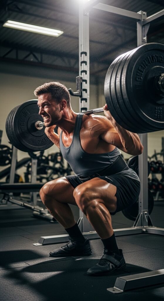 A muscular athlete performing a heavy squat with a barbell in a power rack. The athlete’s muscles are visibly tense, showing strength and focus. Chalk dust is slightly visible in the air, and the lighting highlights the definition of the body. The background includes gym equipment and mirrors, adding depth. The scene captures intensity, determination, and the raw power involved in strength training.