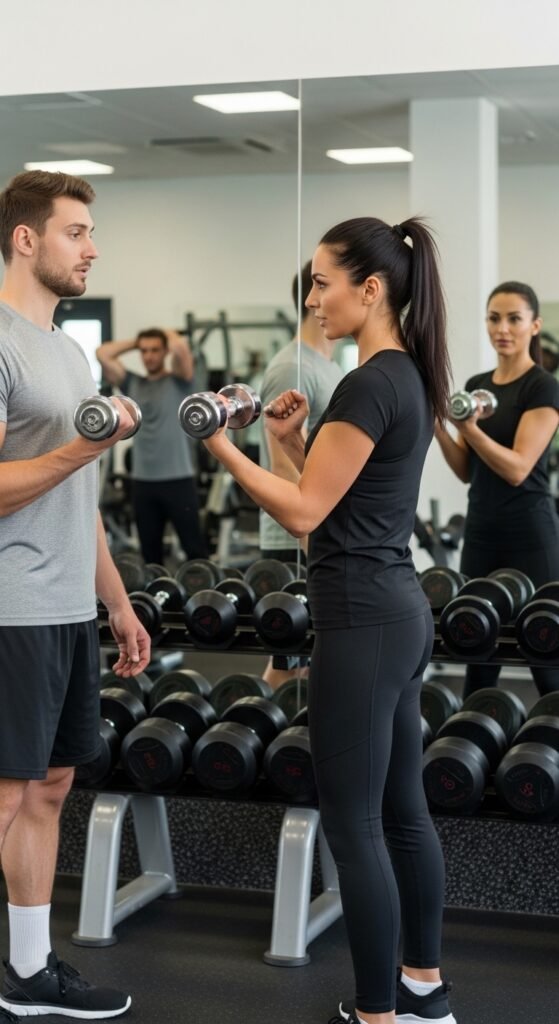 A personal trainer guiding a beginner through a workout routine. The trainer is demonstrating proper posture while the beginner follows attentively. Both are standing near dumbbells and mirrors. The trainer’s expression is encouraging, while the beginner looks determined but slightly nervous. The environment is supportive and educational, emphasizing the importance of guidance and proper technique in fitness.