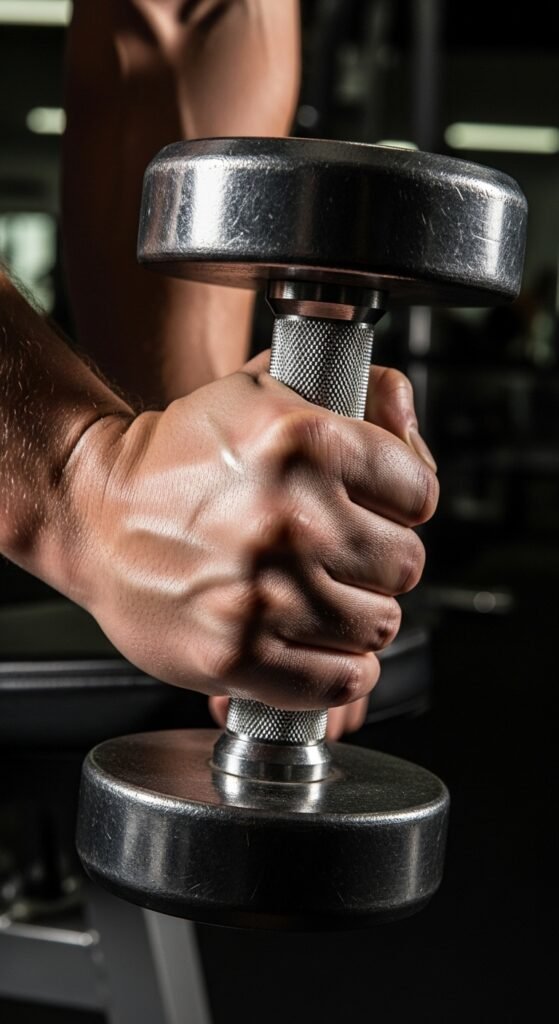 A close-up of hands gripping a dumbbell tightly, with visible veins and sweat. The background is blurred, focusing attention on the effort in the hands. The metal texture of the dumbbell shines under gym lighting. This image symbolizes strength, effort, and determination. It captures the small yet powerful moments that define progress in the gym.