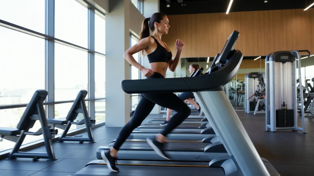 This image shows a high quality treadmill placed in a well-lit home gym. The display panel, running belt, and incline features highlight its usability for both beginners and advanced users.