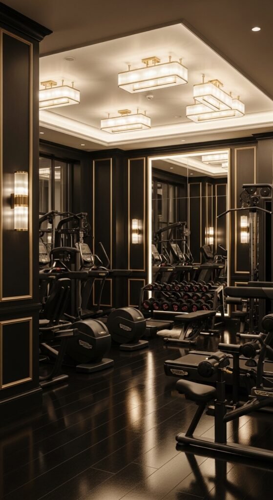 A premium gym wall featuring a black matte base with elegant gold accents and geometric patterns. The gold detailing reflects light subtly, giving a luxurious and sophisticated feel. Paired with upscale equipment and ambient lighting, this design creates a high-end fitness studio vibe that feels both powerful and refined.